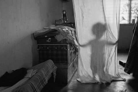 TIRUCHI, India — A refugee child hides behind a curtain in a shelter.