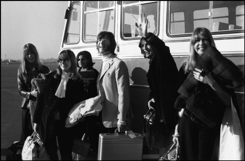 DELHI, India — John Lennon, George Harrison, and their wives at Palam Airport on their way to meet Maharishi Mahesh, the inventor of Transcendental Meditation.