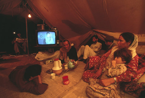 |  | PESHAWAR, Pakistan — A family of Afghan refugees watches Pakistani TV in their tent, 1988.